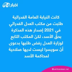 وكانت النيابة العامة الفدرالية طلبت من مكتب العدل الفدرالي في 2021 إصدار هذه المذكرة بحقّ الأسد، لكنّ المكتب التابع لوزارة العدل رفض طلبها بدعوى أنّ سويسرا ليست لديها صلاحية لمحاكمة الأسد كونه ليس مواطناً سويسرياً ولا هو مقيم في سويسرا ولا حتى يمتلك مسكناً في هذا البلد.