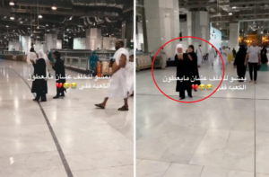 ويظهر في المقطع “سيدتان يمسكان بيد بعضهما ويخرجن من صحن الكعبة وبيت الله الحرام وهم يعطيان وجوههما للكعبة بينما يسيران بالعكس ويصعدان السلم بظهرهن بينما يستمران في رفع أيديهن للدعاء”.