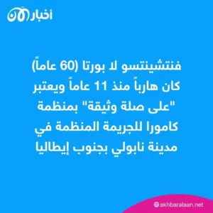 وقال بيان للشرطة إن فنتشينتسو لا بورتا (60 عاماً) كان هارباً منذ 11 عاماً ويعتبر “على صلة وثيقة” بمنظمة كامورا للجريمة المنظمة في مدينة نابولي بجنوب إيطاليا.