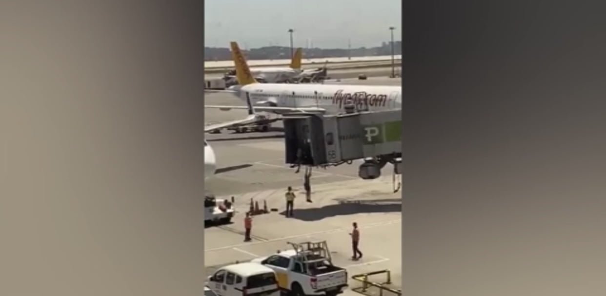 بالفيديو.. مشهد صادم لمسافرين تعلقا بالطائرة بسبب التأخير